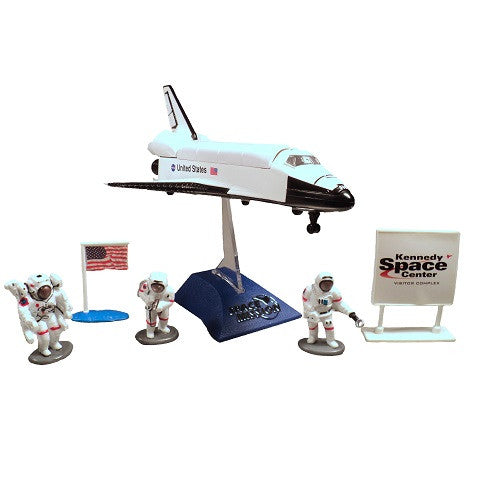 Made of die-cast metal and plastic parts, this set includes a Space Shuttle with stand, 3 hand painted astronauts, an American flag, and a Kennedy Space Center sign.