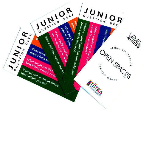 The Jr. Principles, Values, and Beliefs cards are similar, but written for younger children, ages eight and up. The set includes open-ended questions designed to promote moral development, social awareness and civility. This deck is intended for use with children but may be used with adult players too.