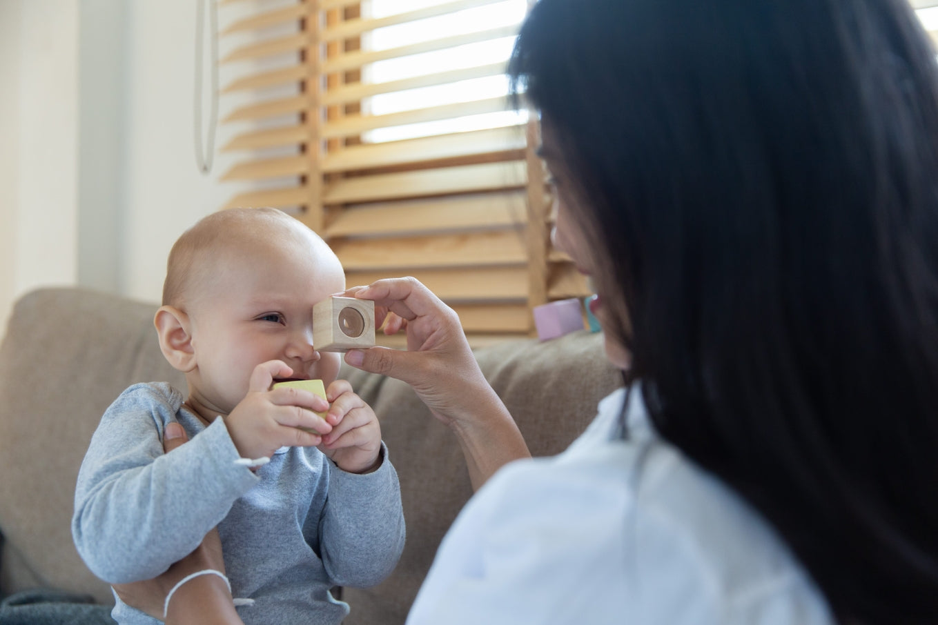• Sensory “show and tell”: Offer 2 blocks at a time and model “shake,” “tap,” “look,” and “feel” to build attention and imitation.