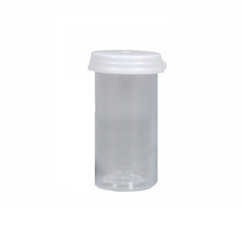 Small, empty, plastic pill bottle.