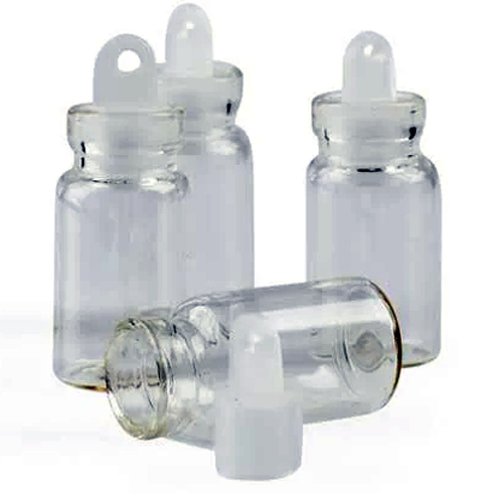 These tiny one inch bottles are clear plastic, with a stopper in the top. There are 8 bottles in a package. Not suitable for the playroom.
