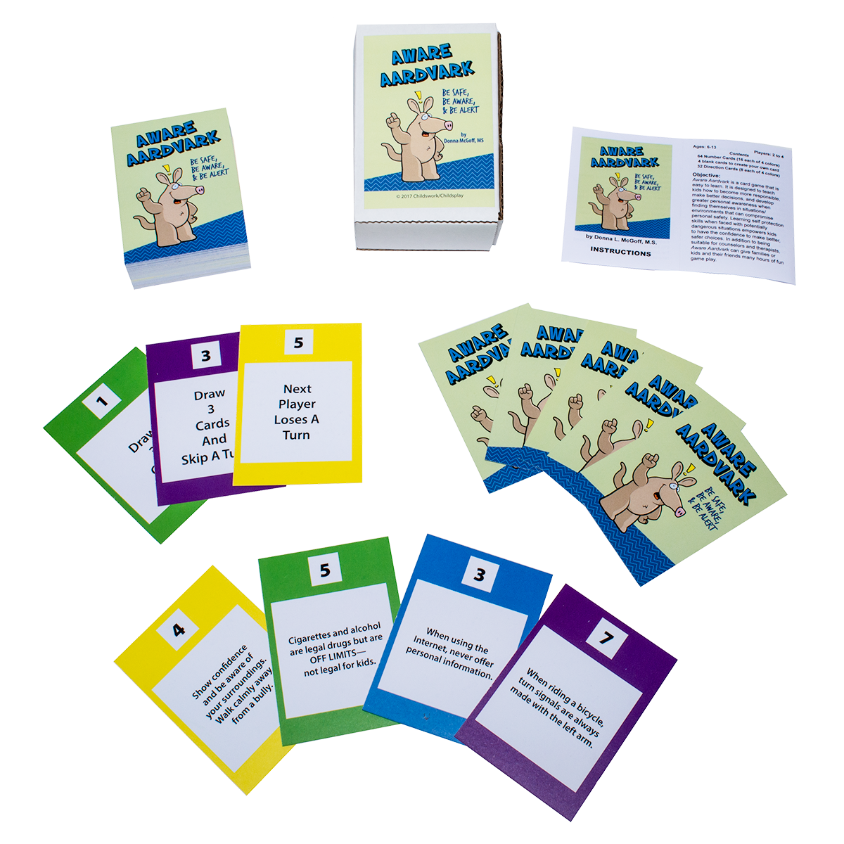 Aware Aardvark is a card game that is easy to learn. It is designed to teach kids how to become more responsible, make better decisions, and develop greater personal awareness when finding themselves in situations that can compromise safety. Learning these skills enhances confidence and empowers kids. The game includes 96 cards, 12 blank cards (to create your own cards), directions, and a sturdy storage box.