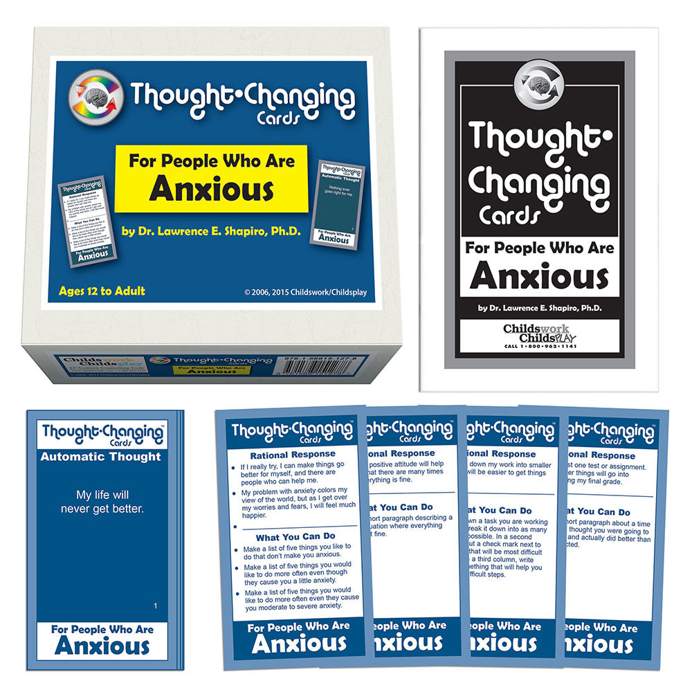 Thought-Changing Cards - For People Who Are Anxious: This kit is intended to help clients control their anxiety, and address the common emotional and social problems that accompany anxiety disorders. The kit contains 50 cards that show cognitive distortions on one side, and rational responses and positive behavioral activities on the other.