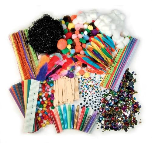 Assortment includes Wax Works, wiggle eyes, chenille stems, pom poms, craft hair, fluffs, glitter glue pens, craft sticks, and sequins & spangles.