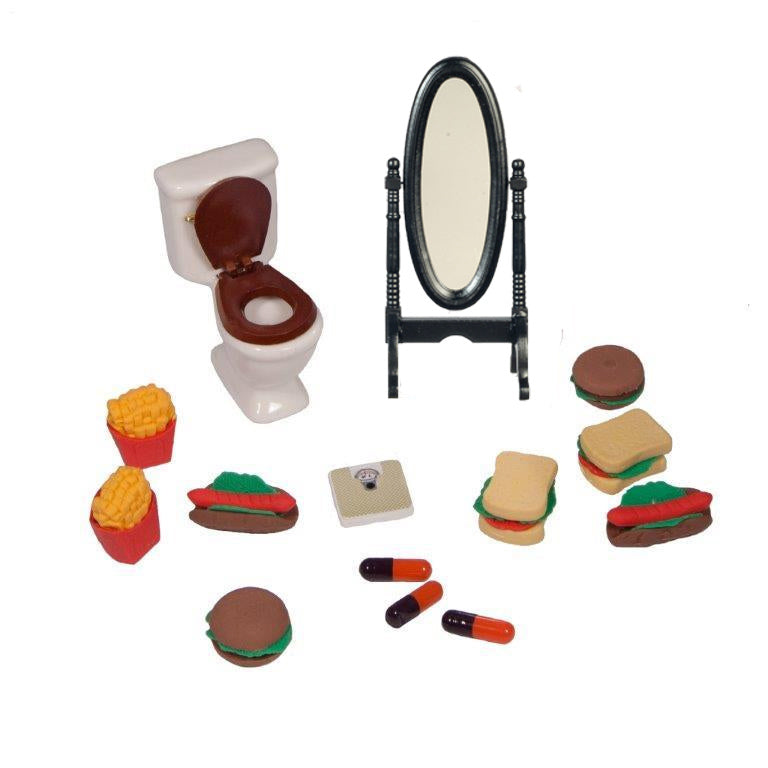 14 piece miniature Eating Disorder set. Includes fake pills, small mirror, toilet, bathroom scale, and 8 piece food set. NOTE: Items are not suitable for the playroom. Substitutions occassionally occur, based on availability. The substitution will be of equal or greater value.