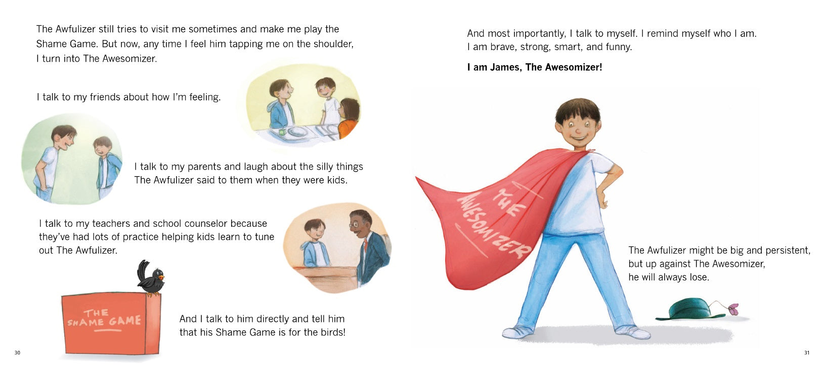 When James finally tells his parents all about The Awfulizer, they help him understand that talking about his feelings gives him a superpower. It turns him into The Awesomizer! And James realizes that even though The Awfulizer might be big and persistent, up against the Awesomizer, he will always lose.