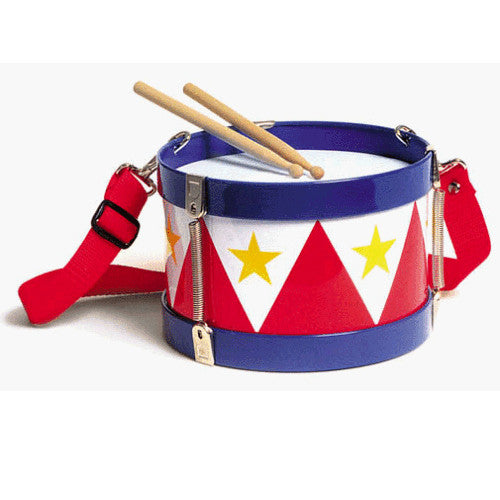 Classic children's tin drum!Two wooden drum sticks and an adjustable strap are included.The drum can be played on either side to make different sounds.Age: 3 years +Dimensions: 7.5" diameter, 5" tall.
