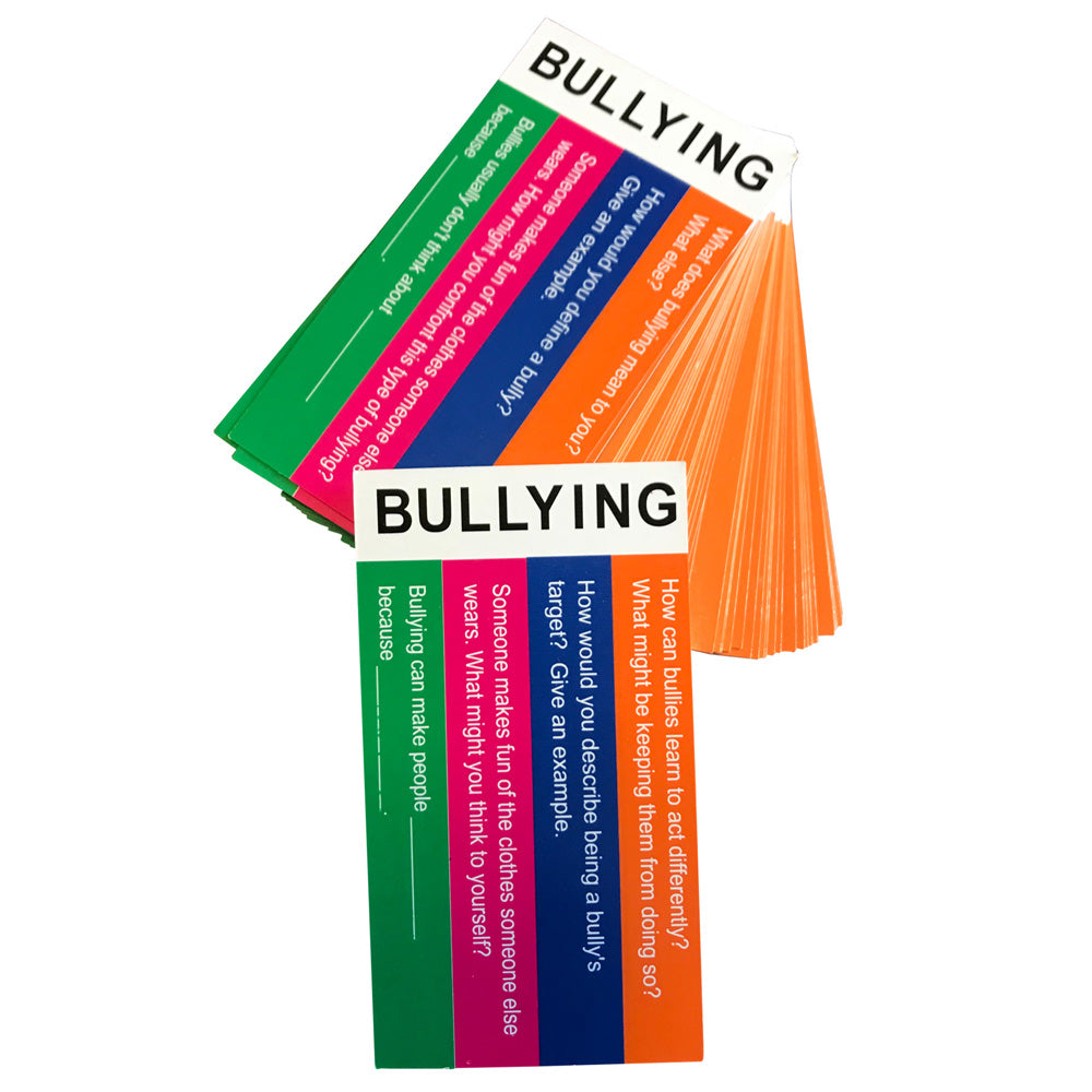 The Bullying cards include open-ended questions, bullying scenarios, sentence completion and prompts addressing the elements of bullying, and are intended to promote discussions about bullying and strategies for coping with and resolving bullying.