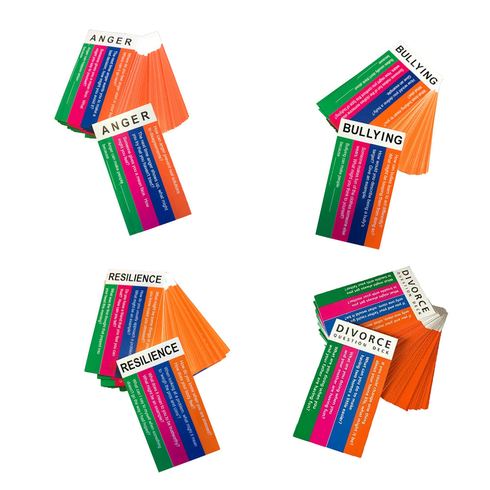 The Anger card deck includes 150 open-ended questions, anger scenarios, prompts and sentence completion intended to promote discussions about and strategies for coping with and resolving anger.
