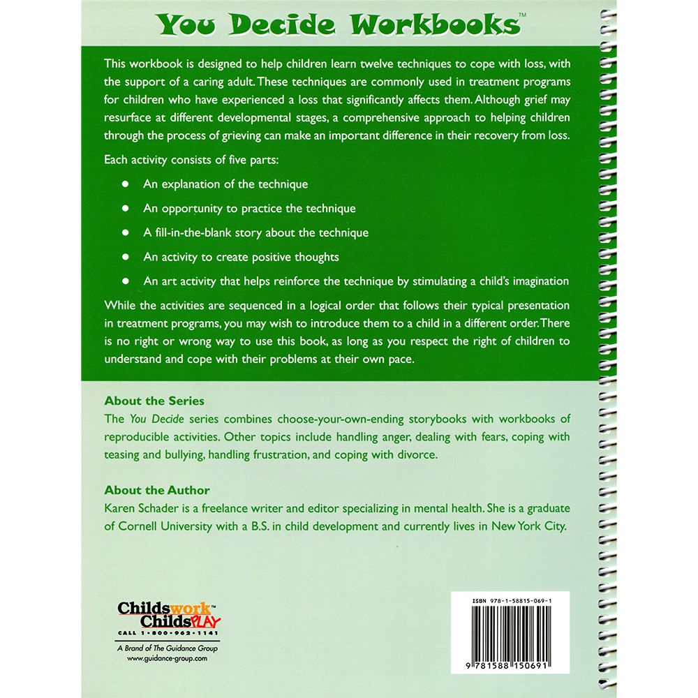 The workbook, by Karen Schader, is designed to help children learn twelve techniques to cope with loss, with the support of a caring adult. These techniques are commonly used in treatment programs for children who have experienced a loss that significantly affects them. Although grief may resurface at different developmental stages, a comprehensive approach to helping children through the process of grieving can make an important difference in their recovery from loss. There is no right or wrong way to use this workbook, as long as you respect the right of children to understand and cope with their problems at their own pace. 66-pages, spiral-bound, includes CD. Each activity consists of five parts: